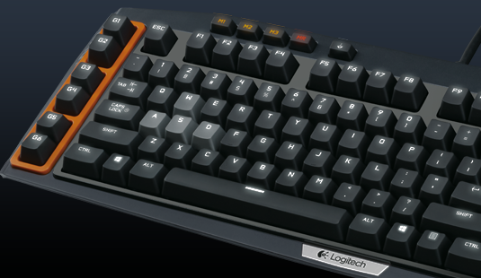 You can?t help but notice the highlighted-in-orange G-buttons on the left side. These six buttons can be programmed for up to 18 functions per game using the Logitech Gaming Software (downloadable from Logitech.com). The M keys at the top-left are used to configure and switch between your different programmed macros.